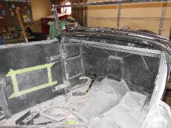 | End of 4th week. Had to modify the back of the body for the gas tank, it's done and the gas tank is in. Fired the engine, runs and sounds great! Started on the body work, both quarters are ready for primer. Found some bad spots, where there was nothing under the gelcoat, had to completely rebuild the drivers door jamb and the front of the cowl on the drivers side. Drivers door is glued together. |