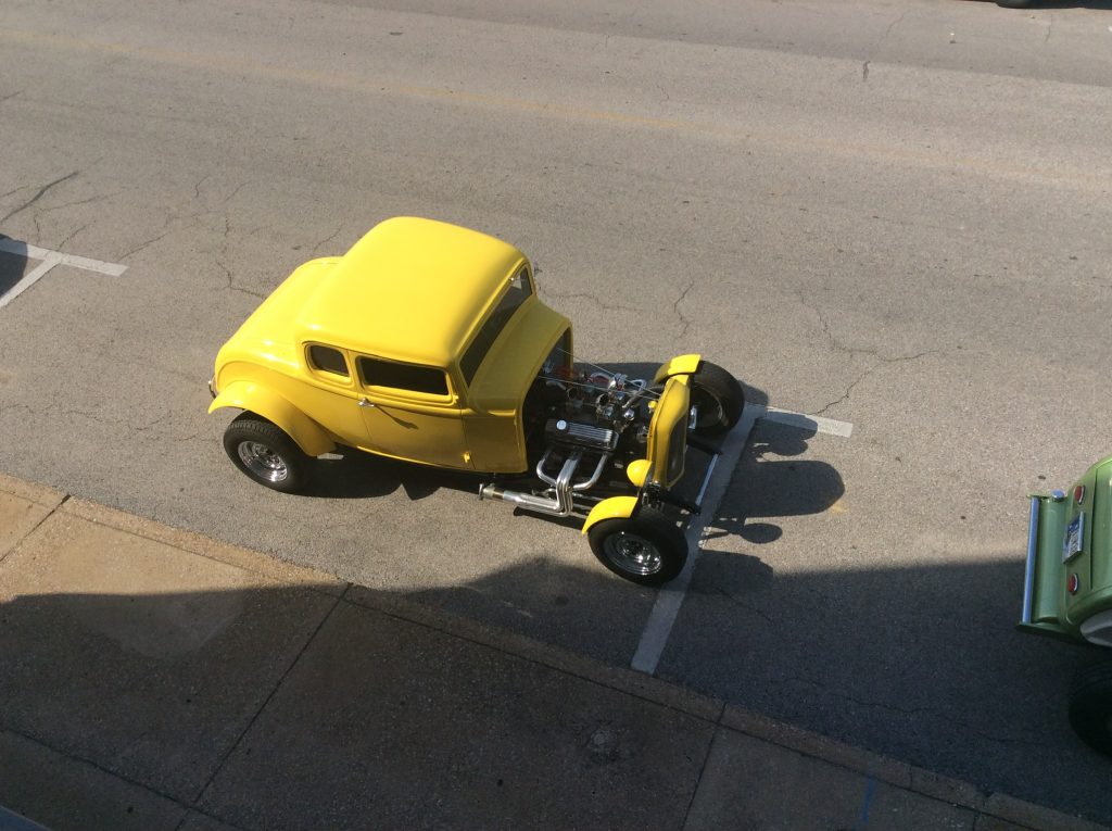 This was kind of a tough one because I only had 8 weeks to build it. Previous projects ran longer and I built this for my wives birthday so it had to be done on time. There was a lot of 18-20 hour days… I got it finished on time, with 1 hour to spare!I built a steel cage inside the body, everything is hinged and latched to steel. I converted it from a trunk to a rumble seat too. I thought I was really rolling along until I discovered the rear of the body was almost 1 inch lower on one side than the other, I had to cut the rear panel out and cut the quarter panel in half and glass it back together. THAT’S A HAPPY FACE! It was well worth all the hours! I’ve made a few changes since I turned it over to my wife. I redid the dash using a ’59 Chevrolet cluster, added a 3 deuce manifold, ’32 Ford headlights and some bigger rear tires.We drive it everywhere, to the grocery store, to the casino, to work, our daughter drove it to high school a few times. It’ll idle in a parade for an hour and it’ll cruise down the highway at 80 all day.